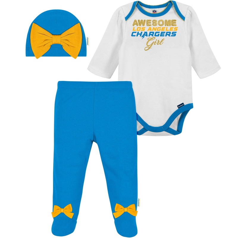 Get her ready for good times on the gridiron with this baby girls’ officially licensed Los Angeles Chargers 3-piece set! With this collection, you’ll receive one long sleeve bodysuit, pants, and a matching cap. The Chargers logo stands out on the bodysuit with festive glitter screenprint and a woven label. She’ll bring everyone smiles on game day with this creative outfit! A gentle elastic waistband on the pants provides a more comfortable fit for active little girls. Whether she’s gathered around the big screen rooting for the family favorite or headed out for a shopping run, the cotton blend interlock fabric will keep her feeling comfortable. There’s never any special treatment required when washing and drying these easy care pieces!