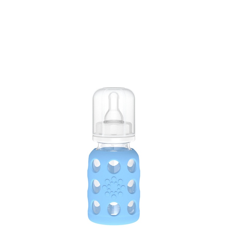 The perfect starter bottle for baby. The Lifefactory 4oz borosilicate glass baby bottle comes with a silicone sleeve, polypropylene cap, ring, and stopper, and a Stage 1 (0-3 months) silicone nipple. These are wonderfully easy to clean: the bottle stays in