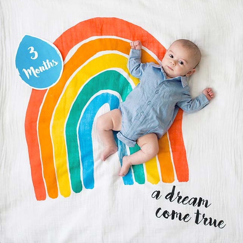 - 101.6cm L x 101.6cm W swaddle blanket with rainbow design and “A Dream Come True” script