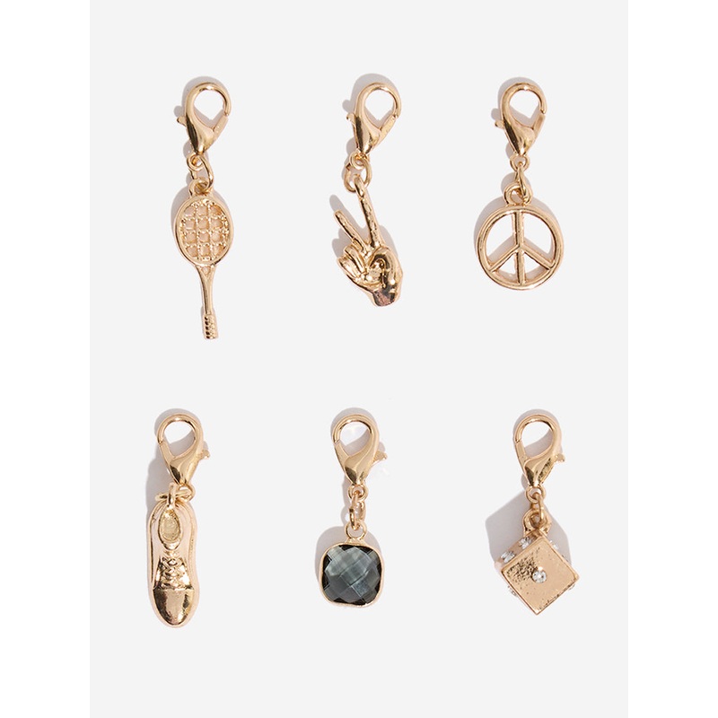 Accessories launches this charm set includes six uniquely designed gold-tone pendants. The collection features a tennis racket, a hand gesture, a peace sign, a ballet slipper, a faceted black stone, and a miniature book charm. Fitted with lobster clasps for effortless attachment, these charms can be styled on bracelets, necklaces, or anklets, offering a personalized and versatile way to accessorize.