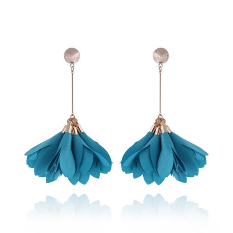 Be the first to review “Aqua Blue Long Satin Flower Petal Earrings | E99035”