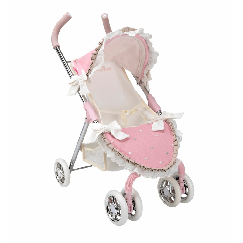 Made from high-quality fabric in a charming pale pink with ivory accents, this stroller not only provides sun coverage for baby dolls with its small hood but also offers added security with a harness. Additionally, a convenient basket beneath the seat provides ample storage for all your little one’s essentials.