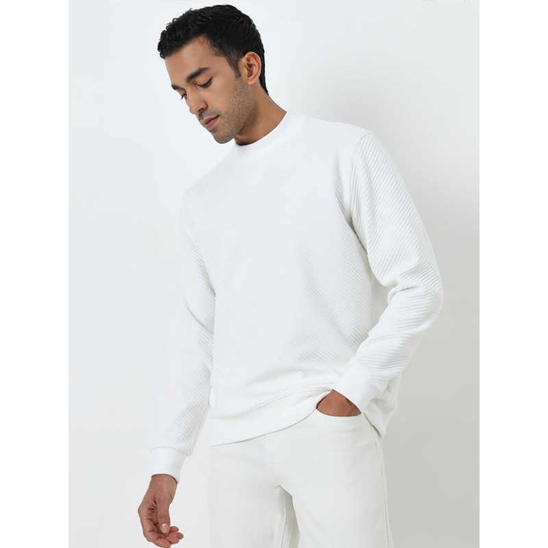 Crafted from a ribbed-textured fabric, this white sweatshirt from Ascot features a relaxed handle. It comes fitted with a high-neck collar and full sleeves for added comfort.