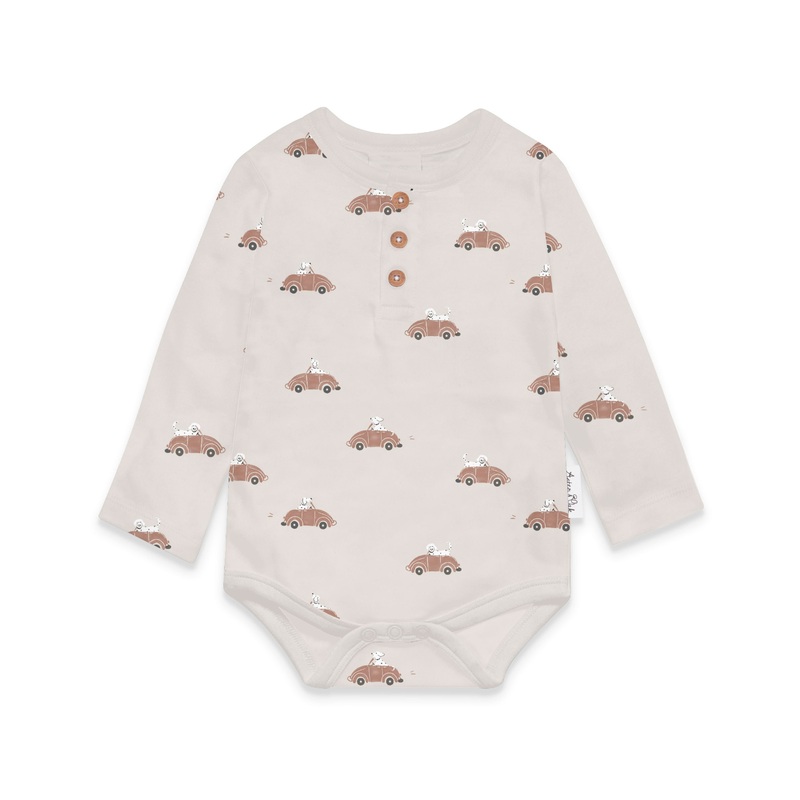 Made with GOTS certified organic cotton, the classic car henley long sleeve onesie features our signature henley neckline with faux coconut buttons with a snap button opening to bottom.