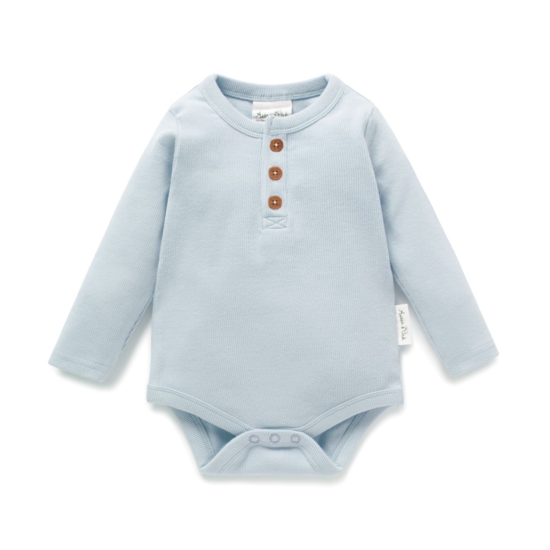 Made with GOTS certified organic cotton, this long sleeved rib onesie is made from soft stretchy cotton rib, with snap buttons to neck and crotch for easy changing.