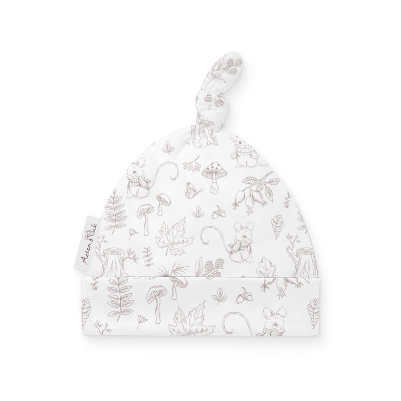 Made with GOTS certified organic cotton, the woodland mouse knot hat features an all over hand illustrated print and adjustable knot that can be altered to fit your babys head perfectly.