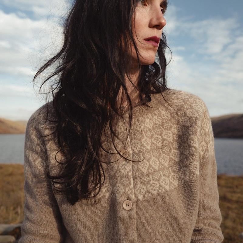 Super softcardigan in 100% Lambswool. Features Autumn leaf yoke pattern with contrast tipping at the neck, hem and cuffs. Courtney & Co. British made Corozo buttons are used in all our SISKIN Knitwear. True to size.Lightweight cardigan, perfect for all yea