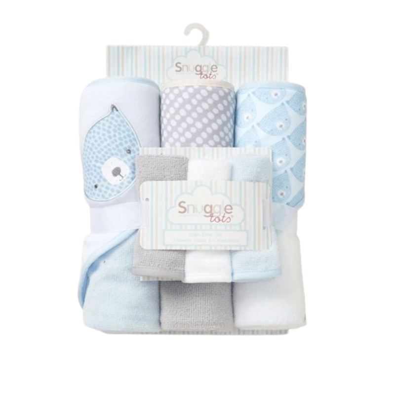 Introducing our Baby Towel and Washcloth Set, the perfect blend of comfort and charm for your little one! This set includes three plush hooded towels and three soft washcloths, each featuring an adorable “Bear” design. The towels come in a soothing blue and grey colour palette and are sized at 71cm x 71cm, ideal for keeping your baby cosy and warm after bath time.