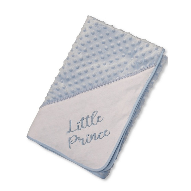Introducing the Blue Baby Boys’ First Blanket by Nursery Time the perfect cosy wrap for your little prince. This luxurious white and blue bubble blanket, measuring 85cm x 85cm, features an embroidered ‘Little Prince’ motif, adding a touch of royal charm.