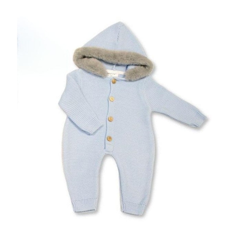 Beautiful knitted blue baby pram suit with grey faux fur collar.
