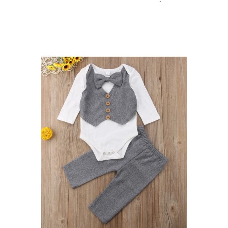 The set includes a one pieceecru bodysuit with attached gray vest and bow tie and a gray pants.