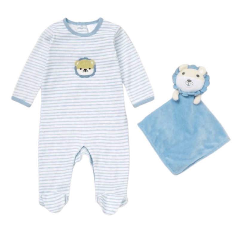 The set is completed with a soft lion comforter, perfect for cuddling. Presented on a padded hanger, this ensemble makes a delightful gift for any new arrival.