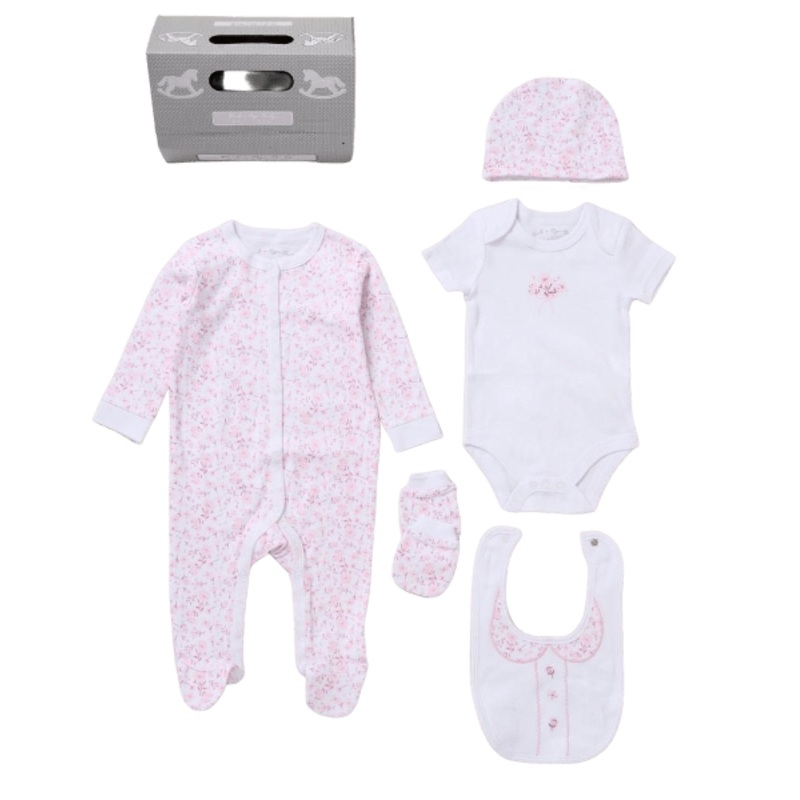 Baby Girls Floral Five-Piece Layette Set White/PinkThis adorable five-piece layette set is the perfect blend of comfort and charm for your little one. Featuring a delicate floral design in soft shades of white and pink, its the ideal choice for those first