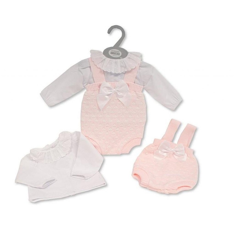Pink Baby Girls Knitted dungarees and shirt set, Pink dungarees with white frill collar shirt.