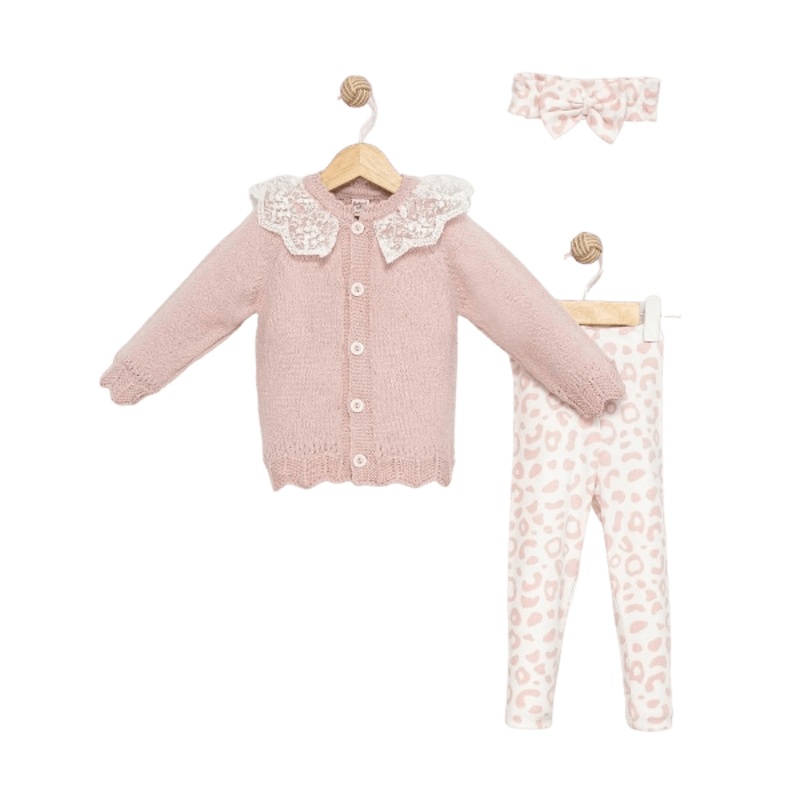 Add a pop of playful charm to your little ones wardrobe with this stylish 3-piece set, perfect for everyday outings or special playdates. The set features a beautifully crafted dusky pink knit cardigan, complete with a delicate lace collar and contrast buttons for a touch of timeless elegance.