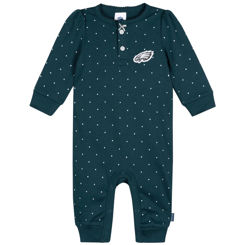 These Eagles Romper are perfect for cuddles, naps, and cheering on Philly. The soft interlock fabric is thick and cozy, with long sleeves and legs to keep baby warm. Ribbed cuffs ensure a snug fit, and snap closures along the legs simplify dressing and diaper changes. Finished with dainty polka dots and a satin neckline bow, its a blend of comfort and hometown pride.