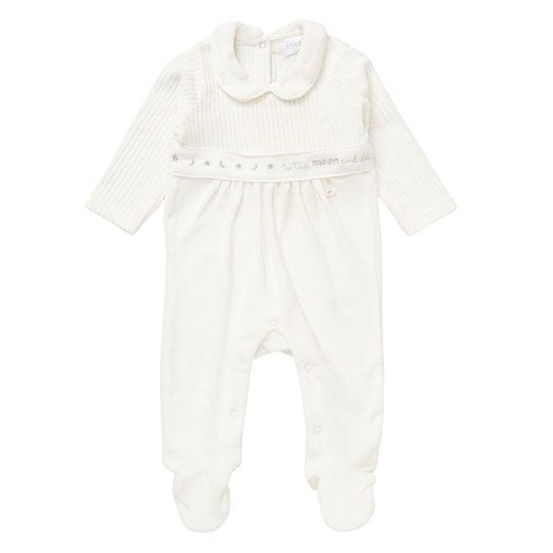 This set is great for both daytime and sleepwear, providing comfort and warmth for babies. The ribbed fabric is breathable, making it a good choice for both cooler and milder climates. This moon print ribbed all-in-one set is a lovely gift for baby showers or as part of a newborn’s wardrobe, especially for those who prefer gender-neutral clothing options. The soft ivory colour combined with the playful moon design gives it a timeless, charming feel.