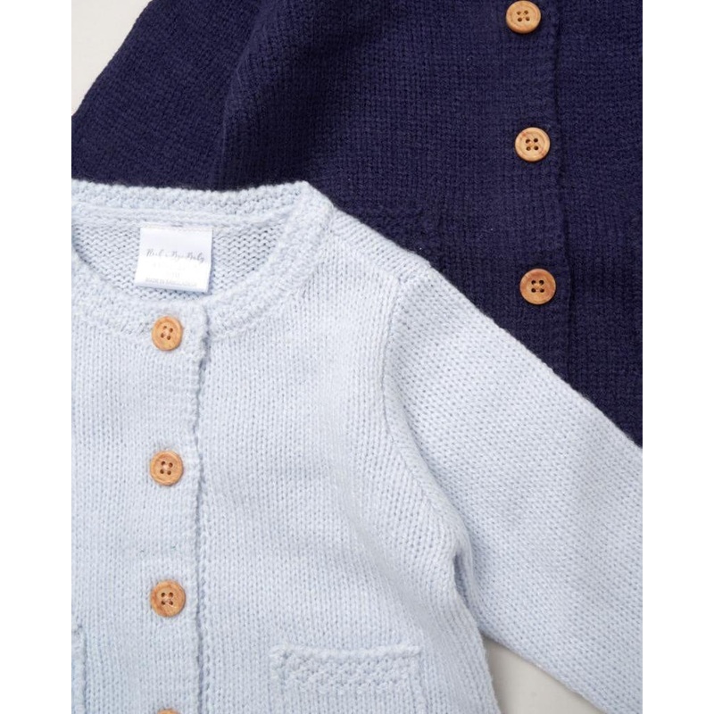 Baby Twin pack round neck knit cardigans with contrast buttons and pockets.One Navy & One Sky