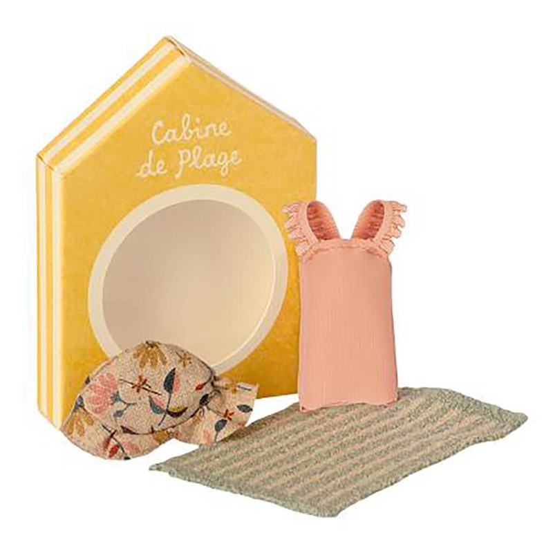 Vacation time. This set includes all essential accessories for a fun day at the beach: a bathing suit, sunhat, and a towel. It all fits the mice in size big sister perfectly.