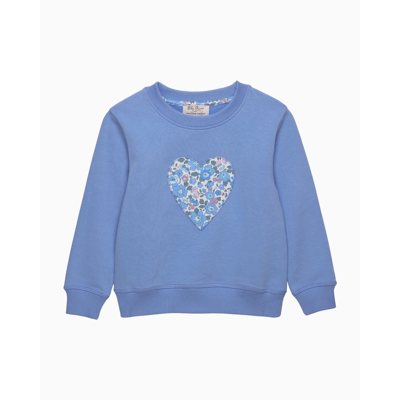 This more relaxed sweatshirt for girls comes in a fresh, pale blue colourway and features a statement appliqu heart design on the front in Liberty’s Betsy print fabric; a classic 1930s floral print featuring an all-over pattern of mixed flowers. Made in a super soft jersey with tonal fleece lining and elasticated cuffs and hem, this makes a great go-to layer for everyday dressing.