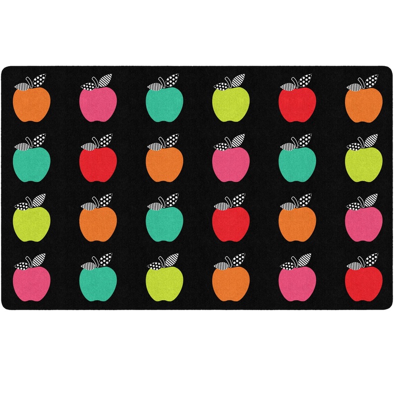 Black, White & Stylish Brights is everything classy black and white, with stunning, bold, and classic Schoolgirl Style colors. A perfect collision of sophistication and fun, this is a timeless collection with elements that will be the focus of any space. The beautiful black and white patterns, blanketed with pops of color are the foundation of this collection and bring charm and delight into the classroom. This carpet with sit spots features a classic apple design that makes group gatherings a breeze.