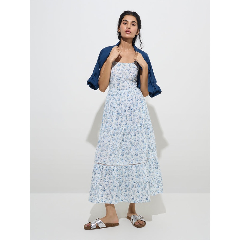Carved in a tiered silhouette, this indigo dress from Bombay Paisley showcases a delicate floral print for a graceful flair. A square neckline with adjustable shoulder straps and a smocked back ensure a flattering fit, while the cropped jacket completes th