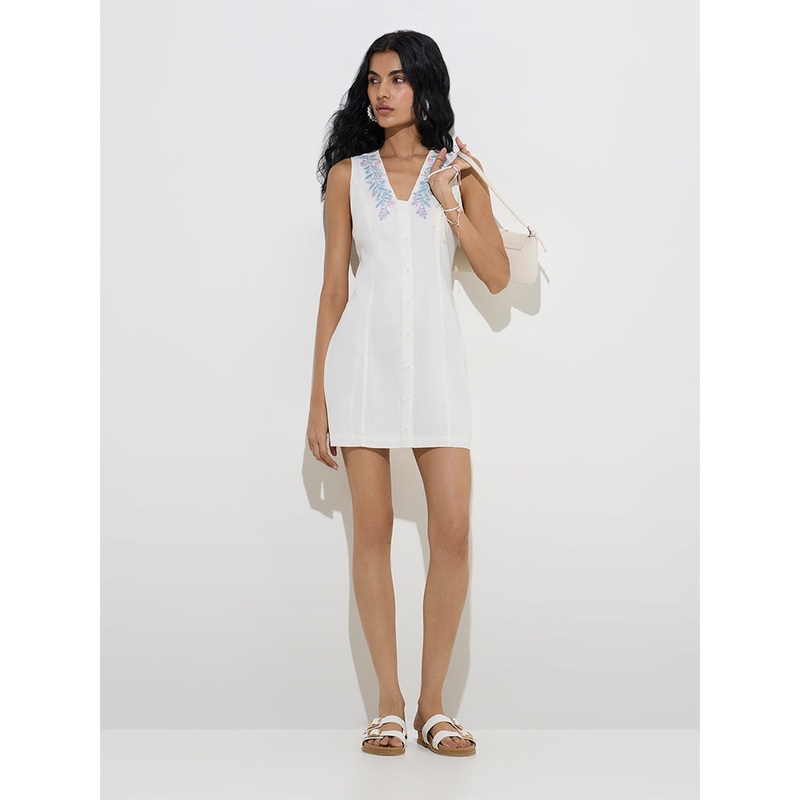 This ivory sheath dress from Bombay Paisley is woven from a sumptuous cotton-linen blend fabric. Designed with a sleeveless cut for all-day comfort, it showcases vibrant floral embroidery along the neckline and a relaxed silhouette that channels boho flair.