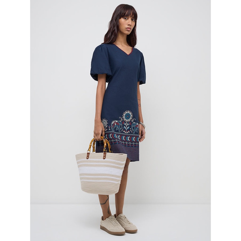 This navy dress by Bombay Paisley exhibits traditional elephant motifs. Made from a cotton-linen blend, it showcases a V-neck and puff sleeves.