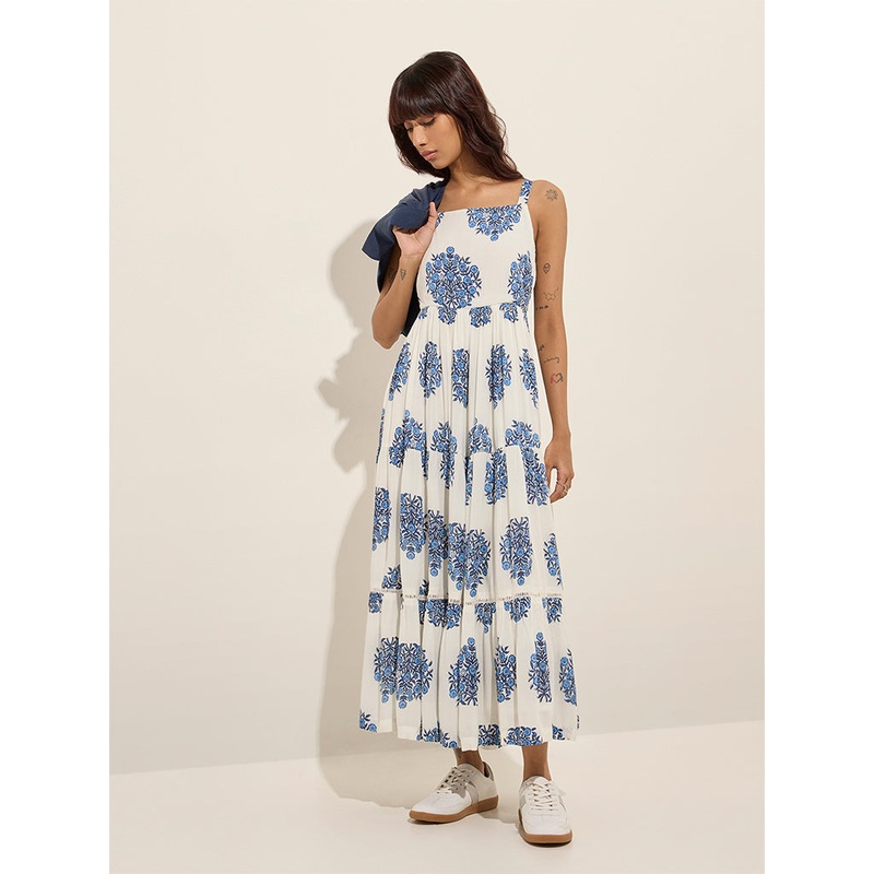 This off-white dress from Bombay Paisley spotlights floral prints. Crafted from a breathable fabric in a tiered silhouette, it includes a square neck and adjustable straps. It is accompanied by a cropped jacket for a complete ensemble.