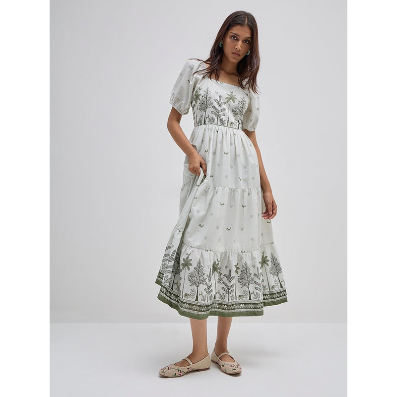 This off-white dress from Bombay Paisley showcases foliage-inspired prints. Designed in a tiered silhouette, the pure-cotton creation is fitted with a square neck, smocked back, and puff sleeves.
