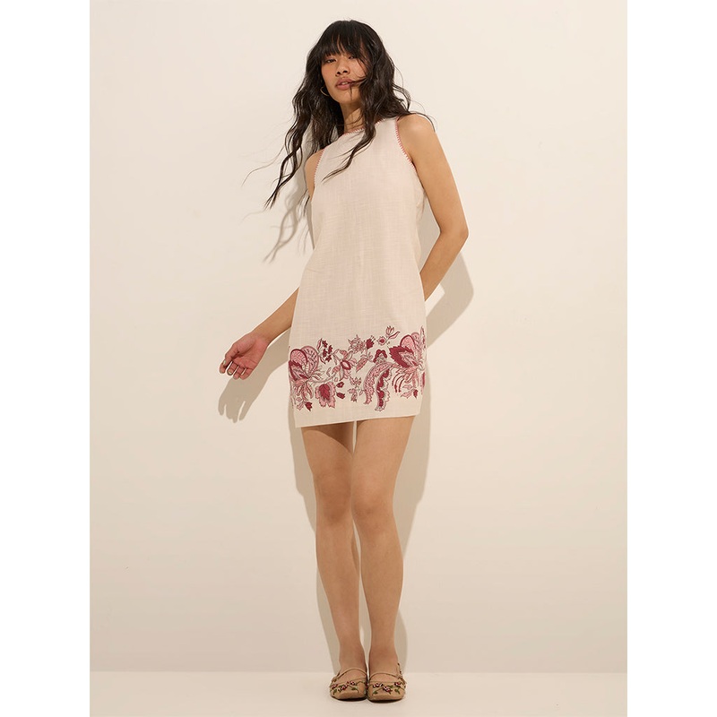 This peach skater dress from Bombay Paisley flaunts floral prints throughout. Made from a breathable fabric, it includes a round neck and sleeveless. The cut-out design at the back coupled with the smocked detailing lends a flattering fit.