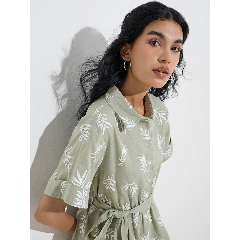 This sage dress by Bombay Paisley is designed with complementing foliage prints in white. Prepared from a cotton-rich blend, it includes a spread collar, button down front and short sleeves. The dress is brought together with a matching belt and belt loops.