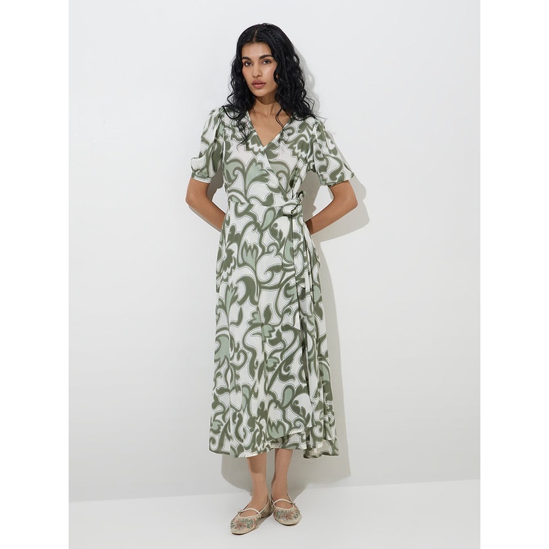 This sage dress by Bombay Paisley is adorned with beautiful paisley prints. The breathable fabric A-line dress is completed with a knot-detailed wrap-style V-neck and puffed sleeves.