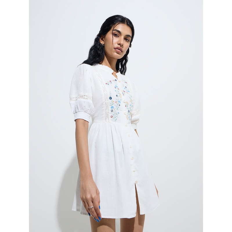 Bombay Paisley White Floral Embroidered Cotton A-Line Dress LBNU253622052075