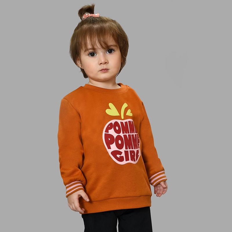 Full-sleeve sweatshirt for girls in soft knit 40% cotton and 60% polyester blend for the winter season. Features full sleeves, printed designs, ribbing at the neckline, cuffs, and bottom hem. Available in different sizes for kids 6M-6Y.