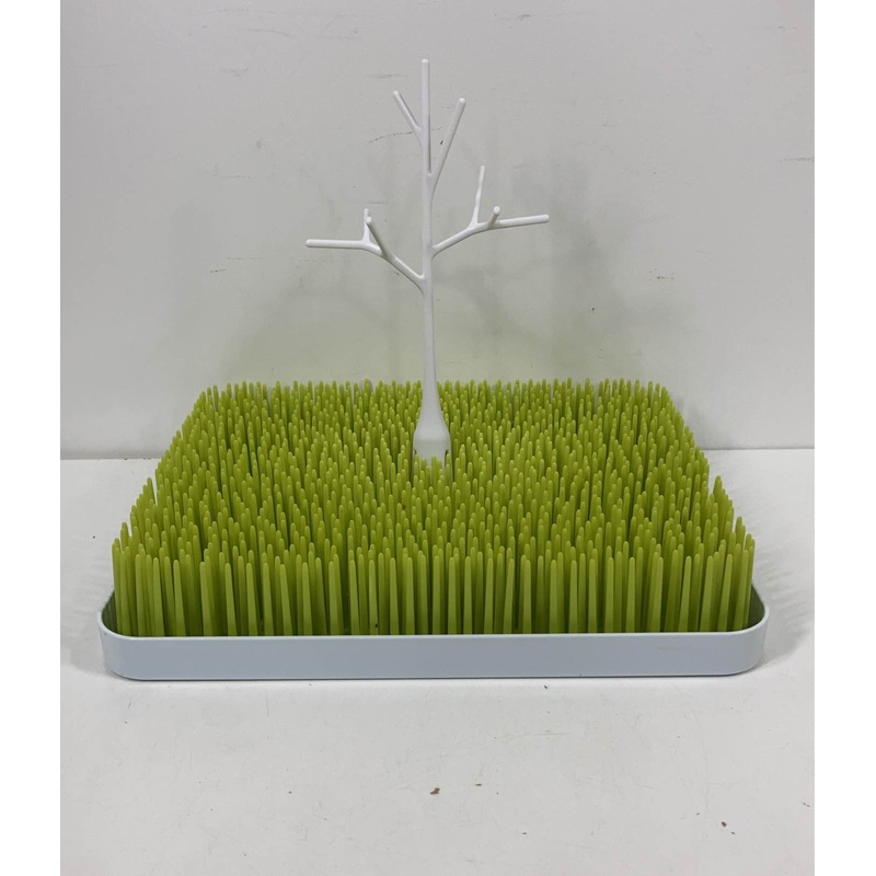 “Handy drying rack that looks like a cute miniature rectangular lawn on your counter top. Perfect for drying bottles, lids, sippy cups, straws, and more. The twig and stem add additional places to dry small item like pump parts and nipples. 11″ x 13″.”
