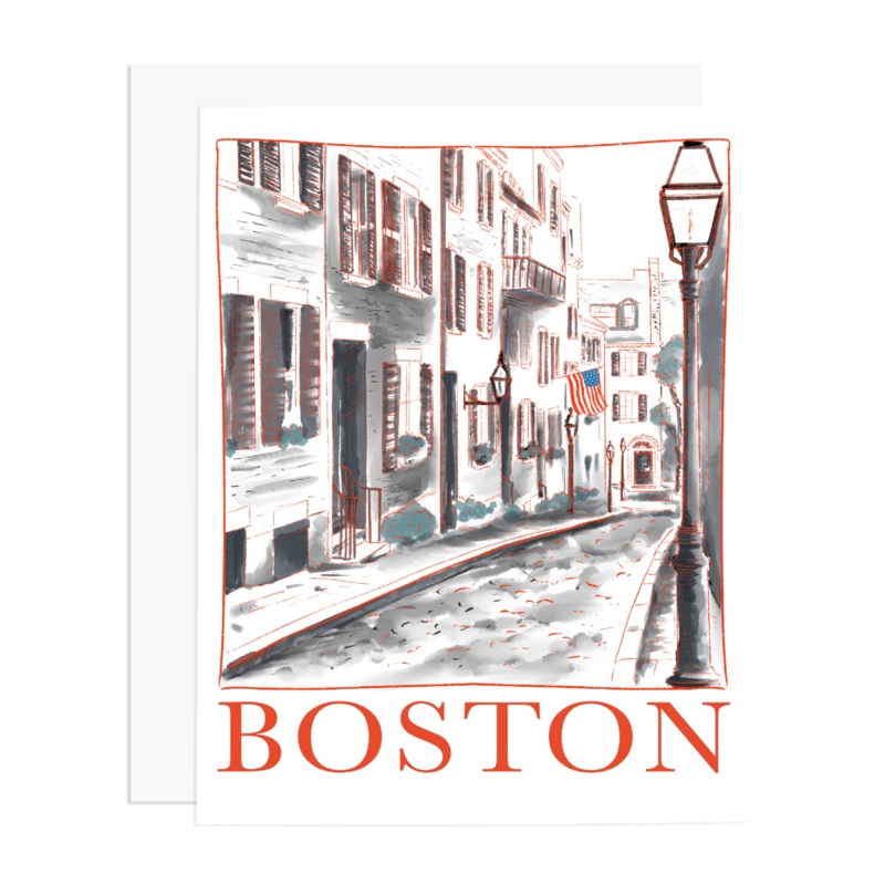 Acorn Street, Boston, MA. One of the most photographed streets in the city, Acorn Street offers visitors a reminiscent ride back to colonial Boston. It was on this lovely street that 19th-century artisans and tradespeople lived and today the row houses are considered to be a prestigious address in Beacon Hill.All our cards are printed on SFI and FSC certified paper. Designed and printed in New England, USA. Beautiful bright white cover paper, blank inside, includes an envelope with peel & stick.