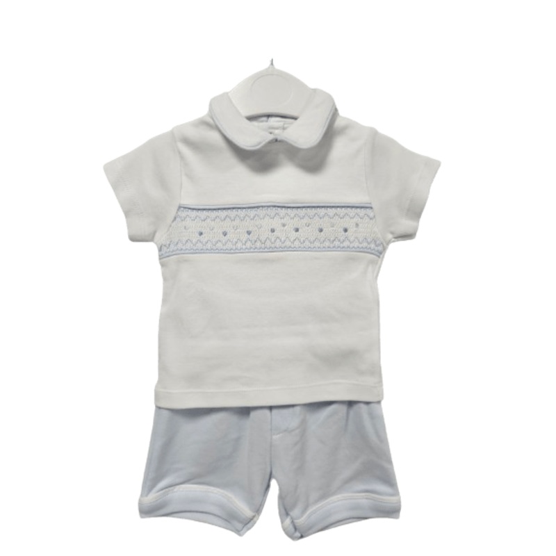 Boys blue and white two piece smocked set