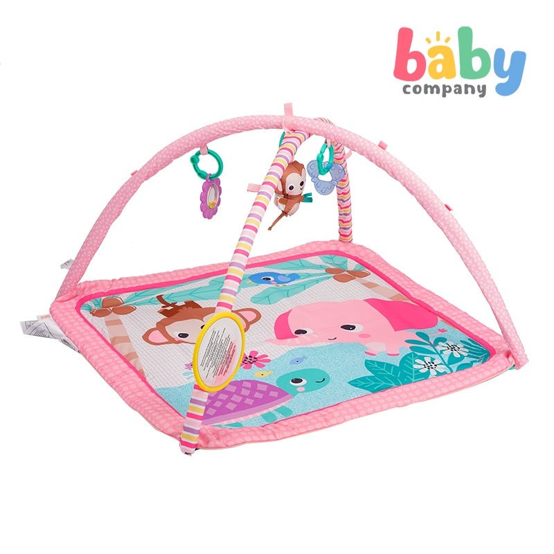 • The jungle-themedbaby tummy time activity mat with bright pops of pink and purple will capture your babys eye, along with joyful, smiling animal characters like the tropical monkey and elephant