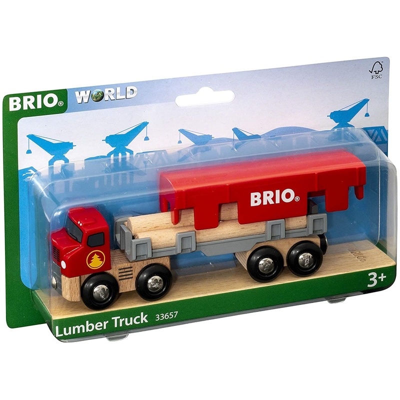 The 33657 Lumber Truck is ready to transport some serious loads around the BRIO World. This long, red semi-truck and detachable trailer features a hidden engine that can be found when the semi-truck cabin is tilted forward, as well as a magnet on the rear end of the trailer to connect to any BRIO World wagon.