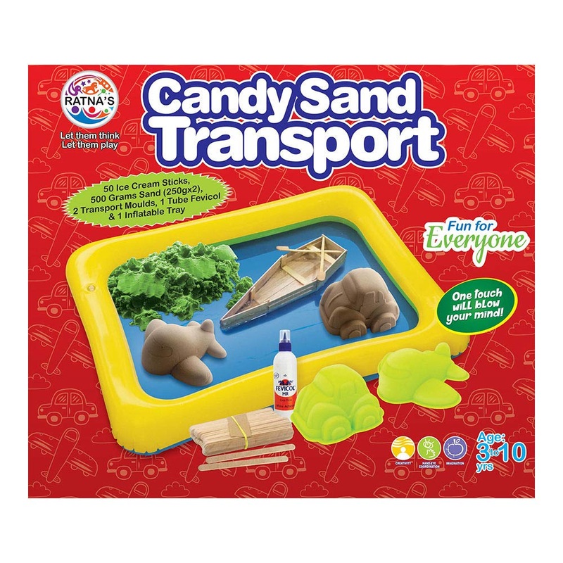 • CONTENTS: 50 Ice Cream Sticks, 500 Grams Sand (250gx2), 2 Transport Molds, 1 Tube Fevicol & 1 Inflatable Tray.