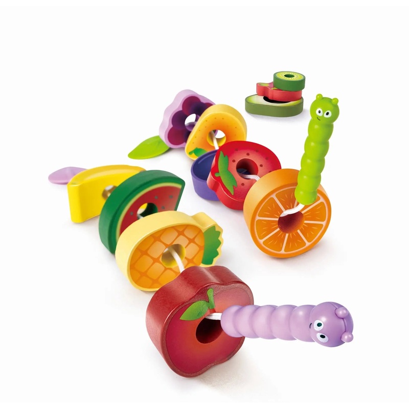 • Fruit pieces have holes in the middle so you can thread them onto the caterpillars’ strings