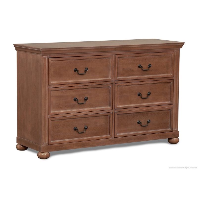 The Chateau Double Dresser provides the ample storage your growing child needs with the long-lasting charm you love. Perfect for holding everything, the six large drawers feature English dovetail construction, glides with safety stops and lightweight, metal handles. Finished with round feet and Simmons Kids signature “soft detailing” on all the edges and corners, this delicately accented dresser pairs perfectly the Chateau Crib ‘N’ More and doubles as a changing table when the coordinating Changing Topper (not included) is attached.