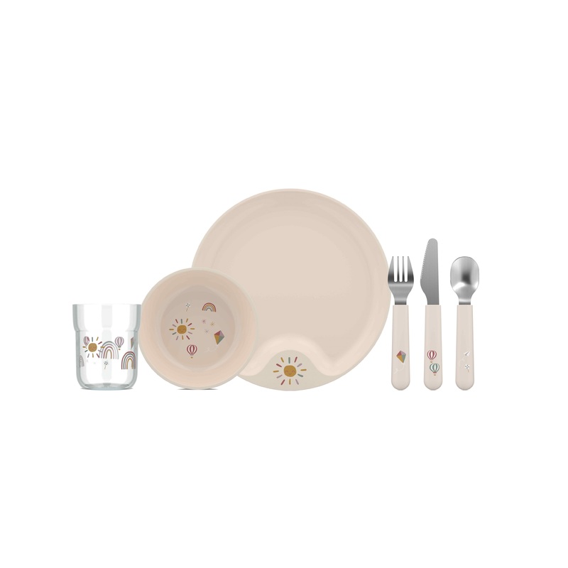 With this 6-pcs Mepal Mio children’s dinnerware set in Sunshine & Rainbow, curious little hands can have a good time. In the set you will find a cutlery set, drinking glass, children’s bowl and children’s plate. The bowl and plate can go in the microwave, so heating up a snack is also childs play. The set comes in a nice packaging, perfect for giving as a present.