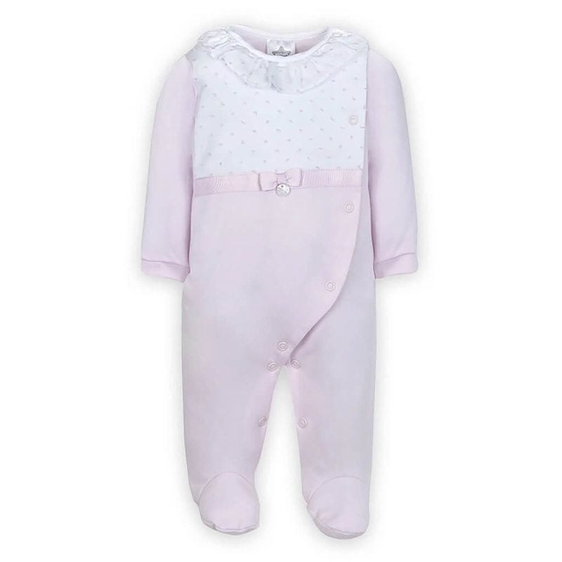 Babygrow in 100% cotton knit, ideal for baby girls and boys, from 00 to 18 months. Tightens with springs in front to full length in front side and crotch. Crew neck with frill.