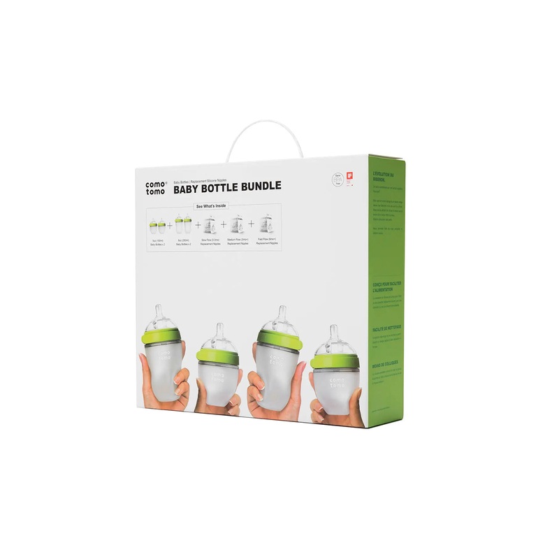 Comotomo Baby Bottle Bundle (7-piece Set) is the perfect gift for expecting or new parents. Our beloved bottles feature an innovative and sensible design to most closely mimic breastfeeding – making building your registry or gifting the right bottles a breeze!Comotomo Baby Bottle Bundle includes:2 x 5oz Bottles2 x 8oz Bottles1 Pack (2 units) x Slow Flow Nipples (0-3 months)1 Pack (2 units) x Medium Flow Nipples (3-6 months)1 Pack (2 units) x Fast Flow Nipples (6+ Months)Designed to mimic breastfeeding to reduce bottle rejection and nipple confusion.Built-in dual anti-colic vents provide consistent milk flow without the unwanted air-intake to prevent colic.Made with high quality, food contact grade silicone for safe feeding, free from chemicals such as BPA, PVC, and Phthalates.Truly wide-neck design makes it easy to clean the bottles by hand without a brush.Safe to clean in dishwashers (top rack), as well as microwave, steam, and electric sterilizers.5oz bottles come with Slow Flow nipples (0-3 months), and 8oz bottles come with Medium Flow nipples (3-6 months). Faster flow available separately.Compatible with most warmers and sterilizers in the market.