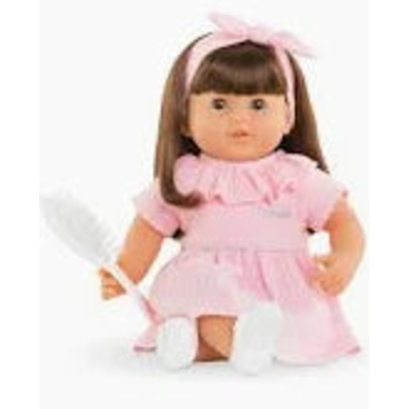 Julie has a huggable plush body. Her head, arms, and legs are beautifully molded from soft-touch vinyl and delicately scented with vanilla. Her bright brown eyes shut when you lay her down as if she’s really falling asleep. But what little caregivers will love most: she has beautiful long hair they can brush to perfection with the included hairbrush! Adorably dressed in a light pink dress, a matching headband, and cute white play shoes, Julie is quick to win your little one’s heart. Part of the Mon Grand Poupon Corolle collection of dolls, accessories and clothing.