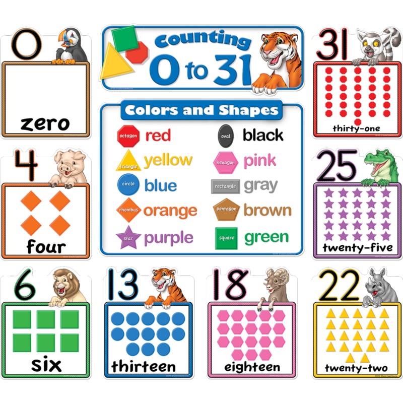 This handy teaching aid helps children learn numbers, colors, shapes, and counting. Each numbered piece is about 6" x 8" h. 4-page Teacher's Guide included. Shiny, protective coating for durability. Includes 34 pieces. This product is acid-free per industr