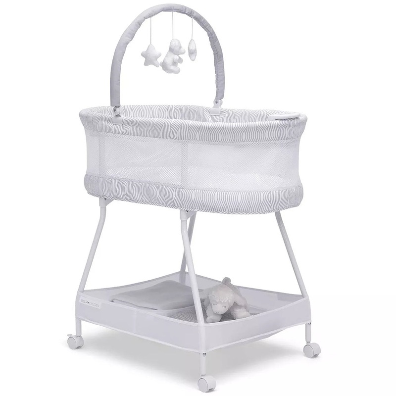 The Delta Children Wave Bassinet soothes your baby no matter where they are in your home. Featuring vibrations, soothing sounds, and a nightlight, the bassinet is designed to keep your baby calm and relaxed for a good night’s snooze.