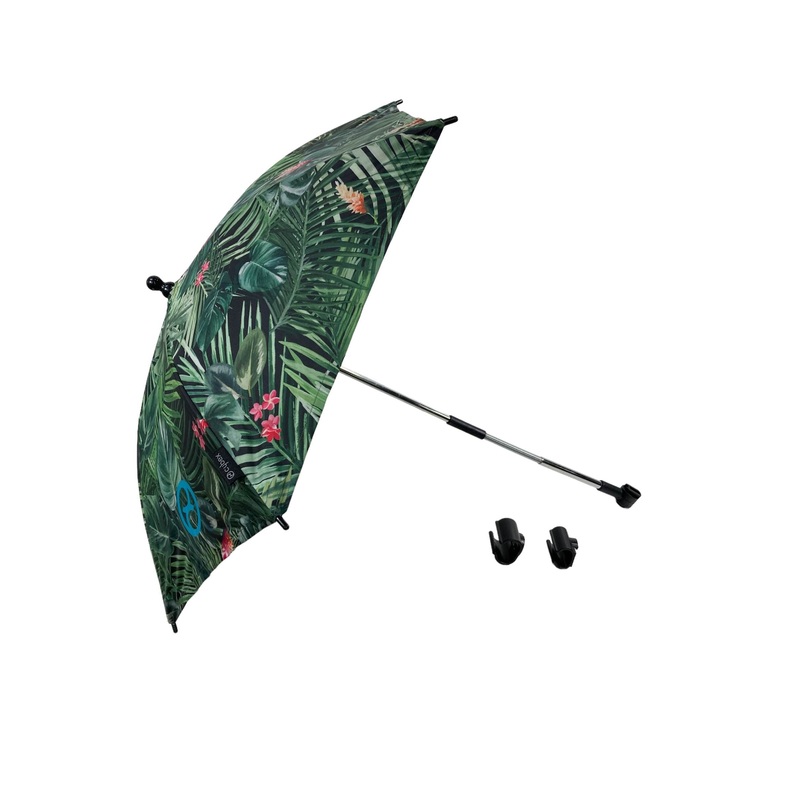 “Hook this adjustable parasol to your Cybex stroller frame and stroll in comfort and style! It provides UVP50+ sun protection.”